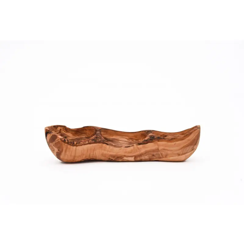 Ce plat en bois d'olivier naturel est doté d'une bordure en écorce rustique.